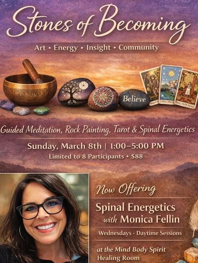 We begin with a guided meditation and crystal singing bowl sound bath, then open the space for intuitive rock painting, a private 15-minute Spinal Energetics session with Monica Fellin, and a 15-minute Tarot reading with Ann-Marie. The afternoon unfolds gently—no rushing, no pressure—just space to create, receive, and integrate.
